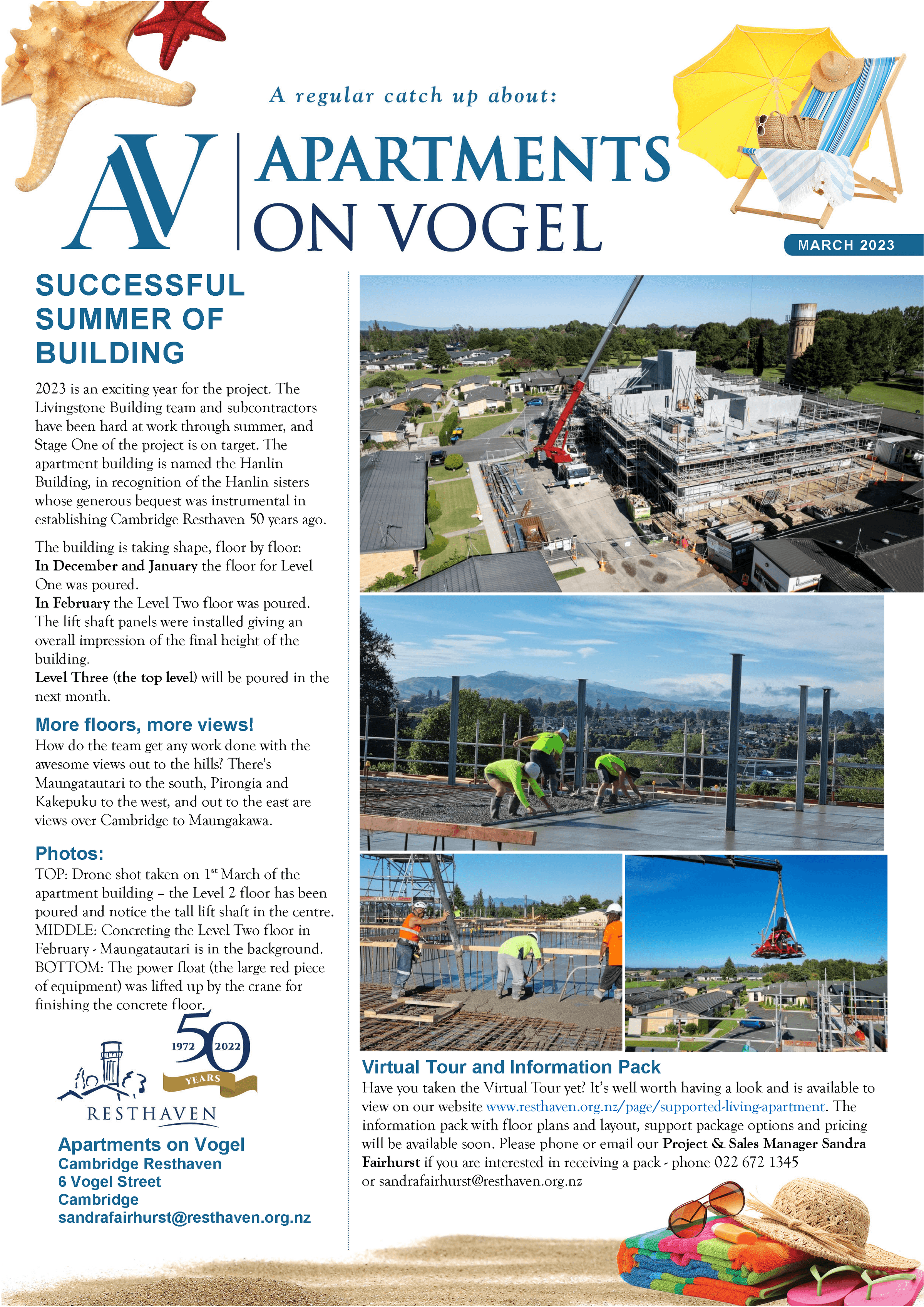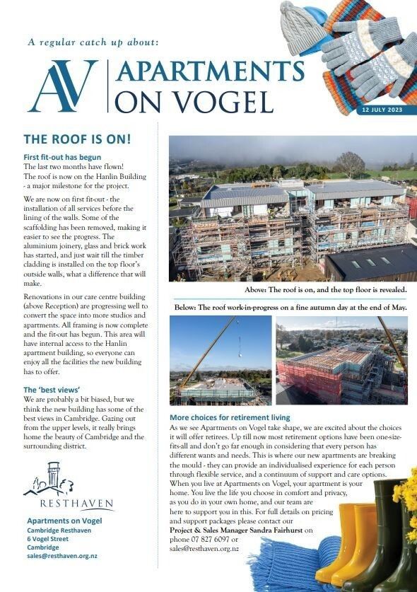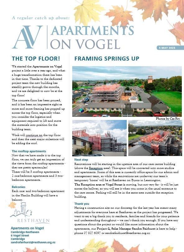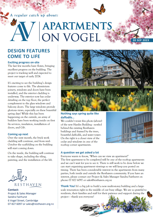 We are loving welcoming residents into their newly completed supported living apartments and care studios in Stage 1 of Apartments on Vogel. The first building is named the Hanlin Building, recognising the generous contribution by the Hanlin sisters in the late 1960s which helped establish Resthaven. Further apartments are planned for Stage 2 and Stage 3.